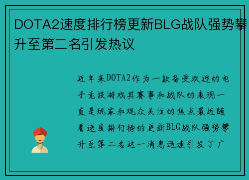 DOTA2速度排行榜更新BLG战队强势攀升至第二名引发热议