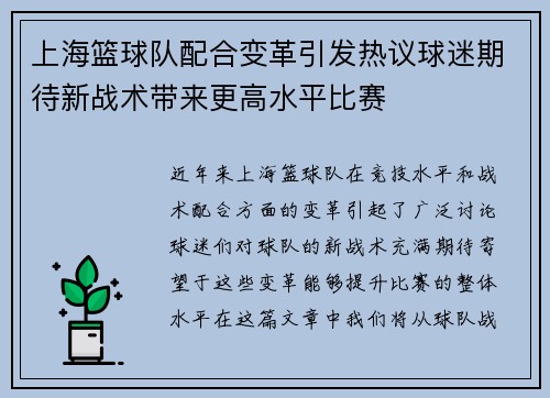 上海篮球队配合变革引发热议球迷期待新战术带来更高水平比赛