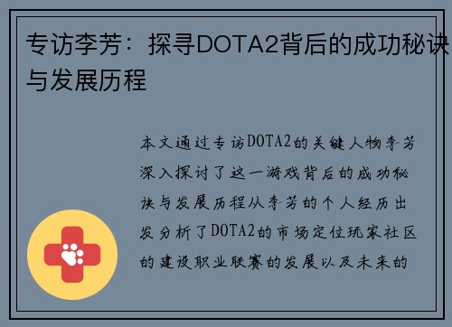 专访李芳:探寻DOTA2背后的成功秘诀与发展历程